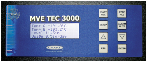 全自動のLN2レベル制御システムがユーザー設定のパラメーターに従って容器を制御します。設定できるパラメーターはLow Level Alarm(下限レベルアラーム)、Low Level Fill Point(下限充填レベル)、High Level Fill Point(上限充填レベル)、High Level Alarm(上限レベルアラーム)で、LN2レベルの全範囲にわたって電子的に調節できます。あふれ防止のために二重化されているソレノイド弁が24VDC、1.0アンペア(最大)で作動します。
